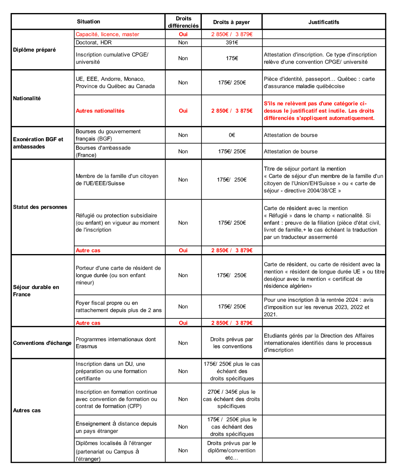 Des droits différenciés s’appliquent aux étudiants étrangers primo arrivants en raison de leur nationalité. Tous les étudiants étrangers doivent acquitter des droits différents sauf les ressortissants des pays suivants (des cas d’exonération existent, cf. II ci-dessous) :