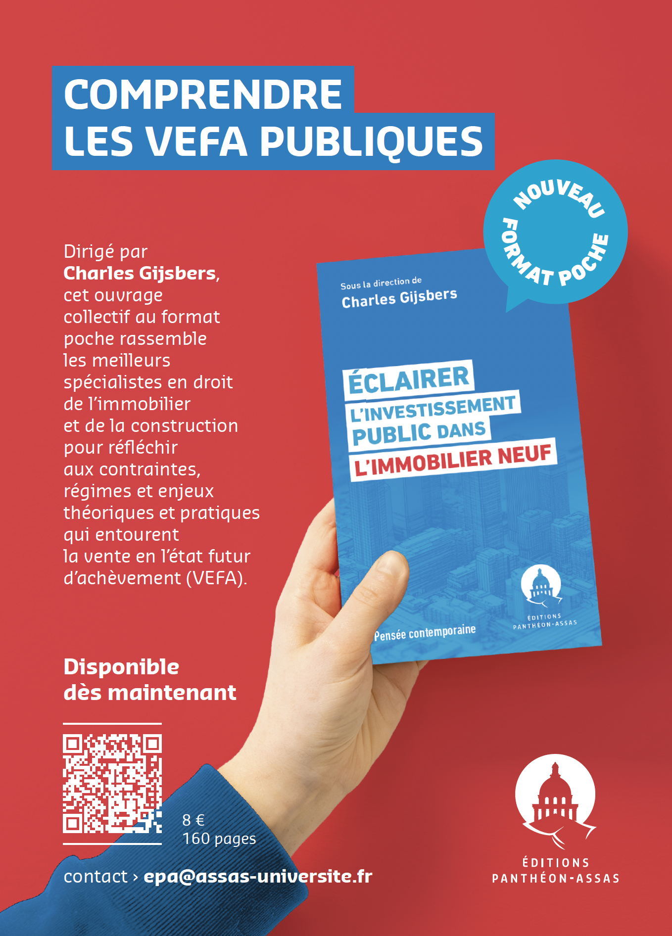 Les Éditions Panthéon-Assas lancent leur collection au format poche et publient ce mardi 1er juillet le premier ouvrage intitulé Éclairer l’investissement public dans l’immobilier neuf, dirigé par Charles GIJSBERS, professeur à l’Université Paris-Panthéon-Assas et responsable du master en droit de l’immobilier et de la construction.