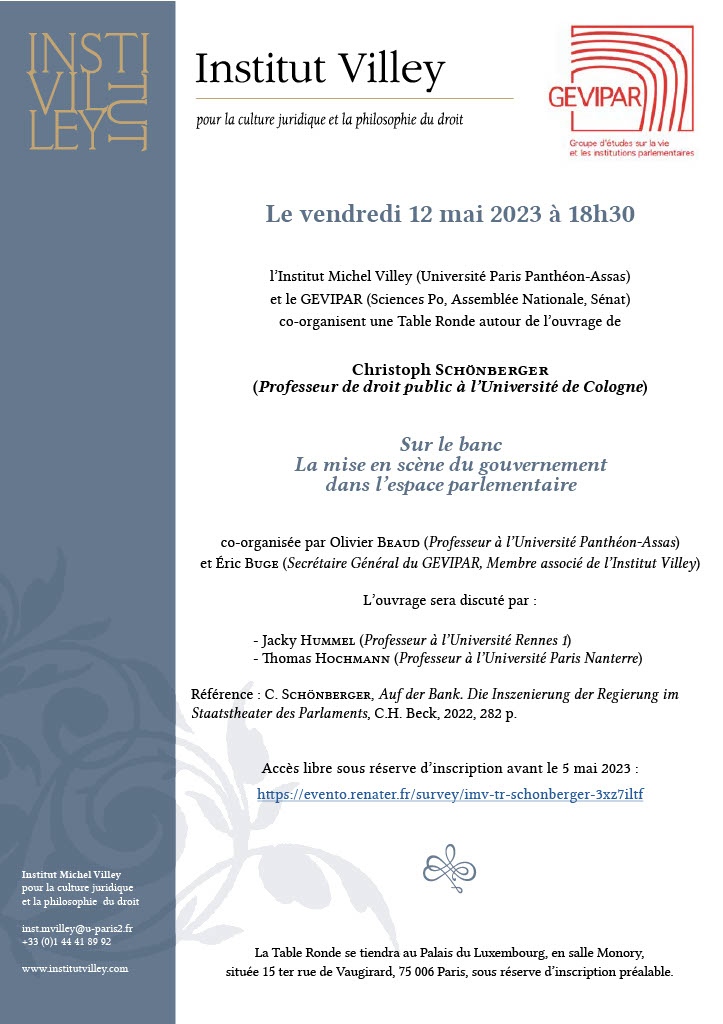 L'Institut Villey co-organisera avec le GEVIPAR (Sciences Po, Assemblée Nationale, Sénat) une table-ronde le vendredi 12 mai à 18h30, autour de l'ouvrage "Sur le banc : La mise en scène du gouvernement dans l’espace parlementaire " de Christoph SCHÖNBERGER (professeur de droit public à l’Université de Cologne).