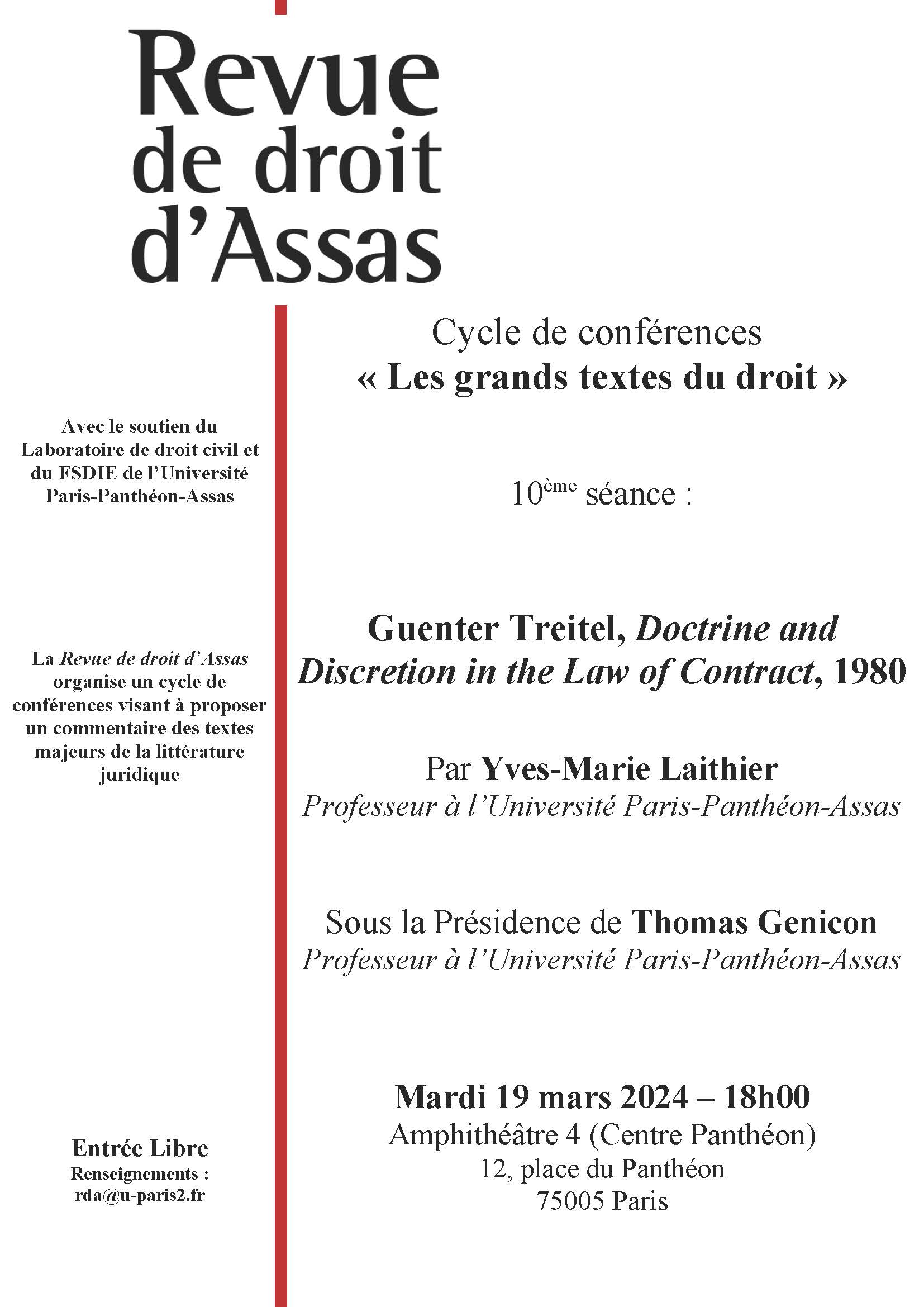 À l'occasion de cette conférence, présidée par le professeur Thomas GENICON, le professeur Yves-Marie LAITIER commentera un texte de Guenter TREITEL (Doctrine and Discretion in the Law of Contract, 1980).
