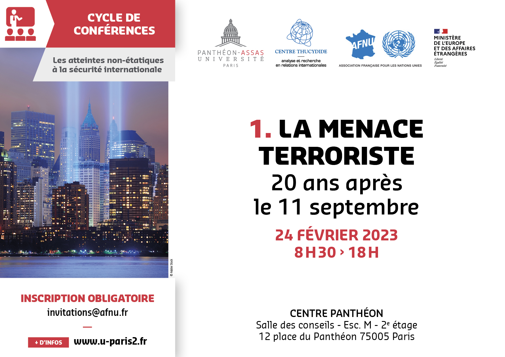 Dans le cadre du cycle de conférences « Les atteintes non-étatiques à la sécurité internationale » organisé par l'Association française pour les Nations unies (AFNU), et le Centre Thucydide, la première journée d'étude « La menace terroriste, 20 ans après le 11 septembre » aura lieu le vendredi 24 février de 8h30 à 18h30.