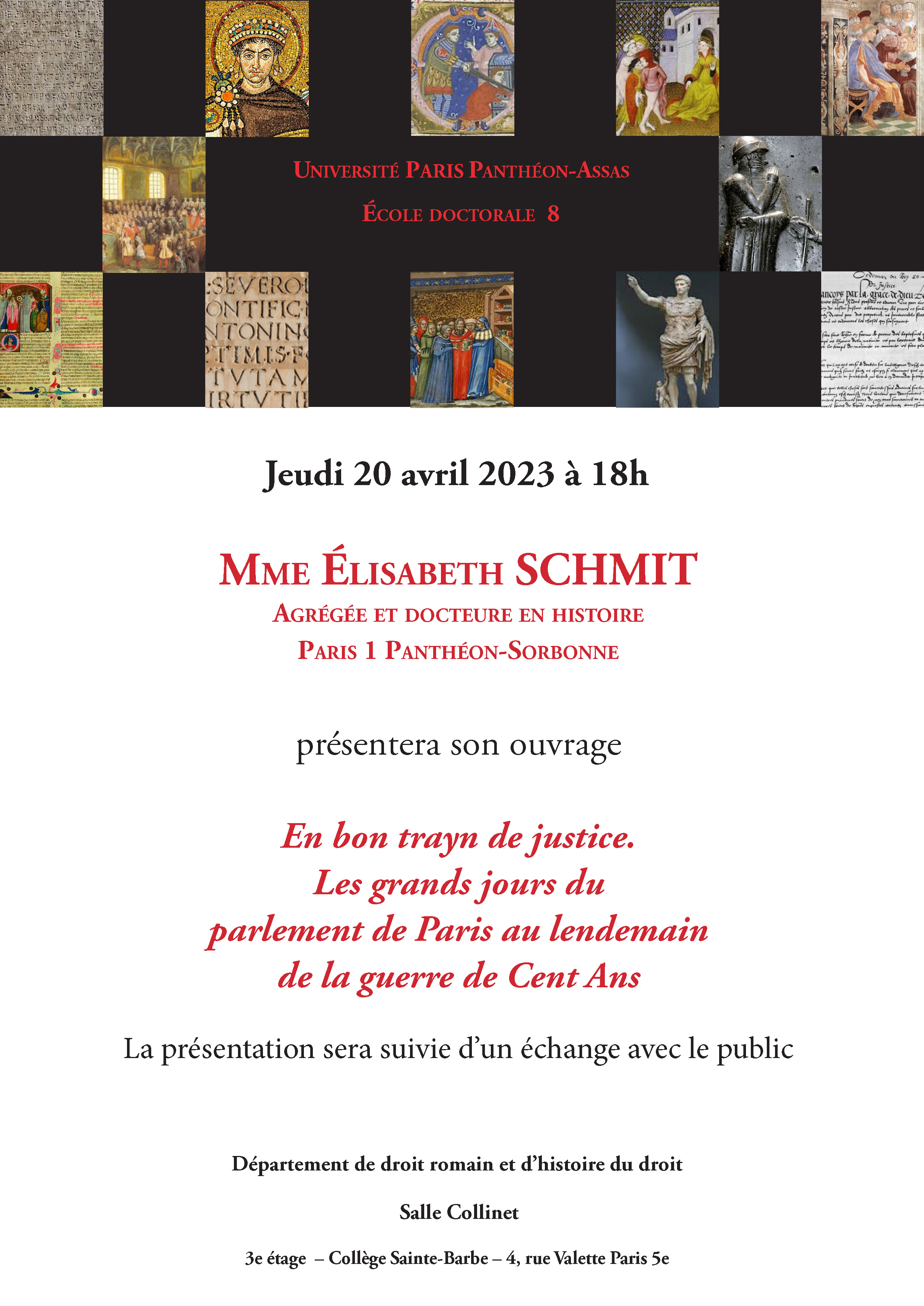 Élisabeth SCHMIT, agrégée et docteure en histoire à l'Université Paris 1 Panthéon-Sorbonne présentera son ouvrage « En bon trayn de justice. Les grands jours du parlement de Paris au lendemain de la guerre de Cent Ans » le jeudi 20 avril à 18h.