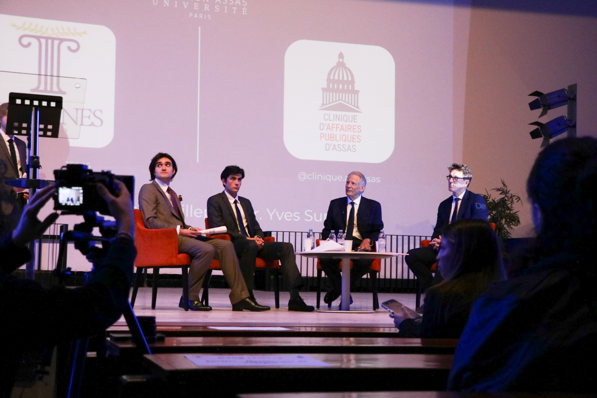 Cet événement organisé dans le grand amphithéâtre du centre Assas, a vu Dominique de VILLEPIN et Yves SUREL, professeur de science politique à l’Université Paris-Panthéon-Assas échanger sur la fabrique de la décision publique. Maxime FEYSSAC, président-fondateur de la Clinique d’Affaires Publiques d’Assas a évoqué les enjeux de la conférence en guise d’introduction avant de donner la parole à Tom BOUËT et Melvin KOSTECKI, membres de la CAPA et Tribunes Assas, qui ont animé la conférence et nourri la conversation en posant des questions précises aux intervenants.