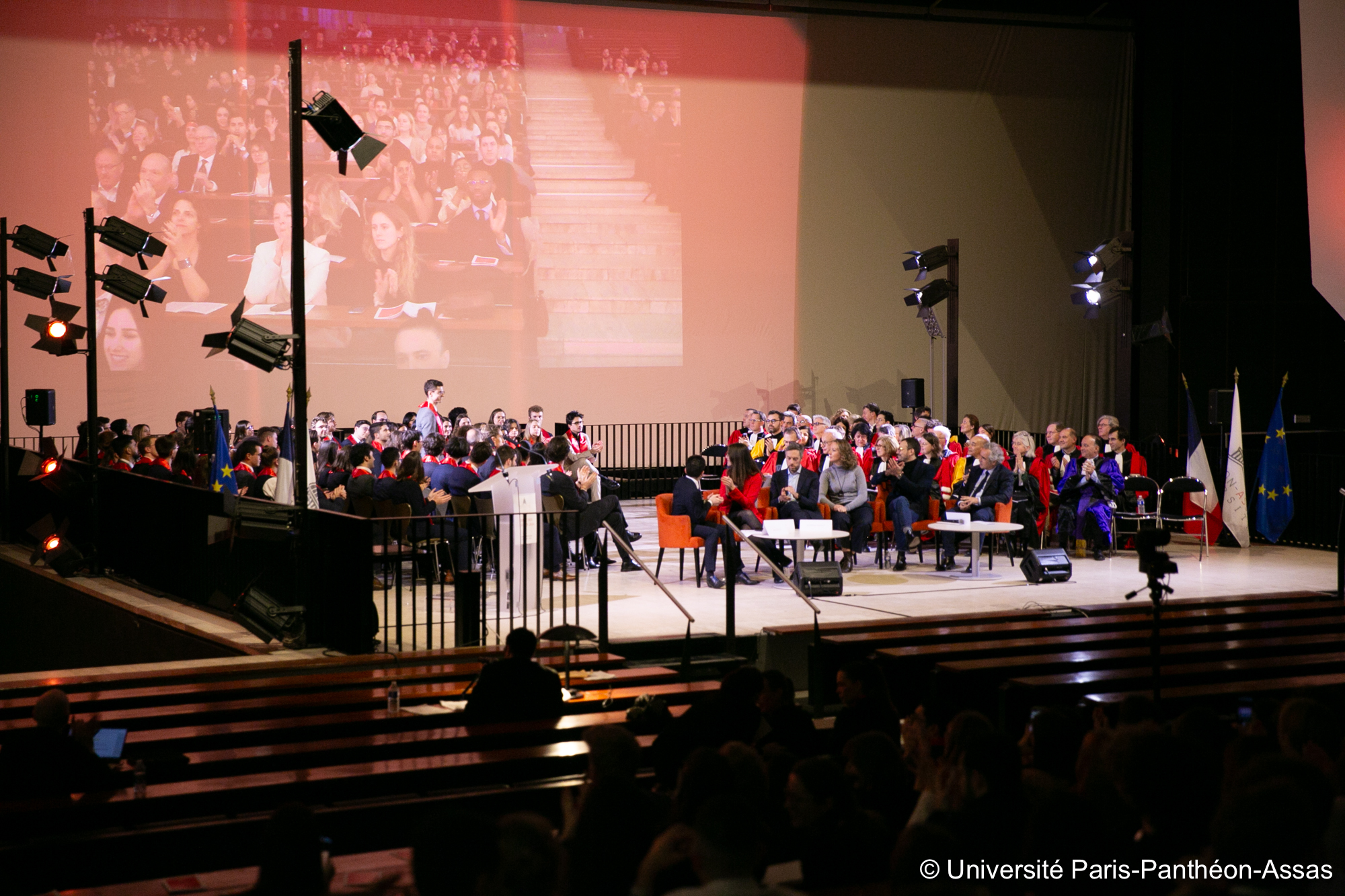La cérémonie s'est ensuite poursuivie avec les témoignages des alumni. Pour la première fois, ces échanges se sont déroulés autour d'une table ronde menée par Julien AZOULAI, alumni 2024, diplômé du master Journalisme à l'Institut français de Presse et journaliste à LCI et France 2. Ce format inédit sur « les défis de demain » a notamment permis d'interroger les alumni sur le regard qu’ils portent sur le monde contemporain, offrant ainsi une réflexion qui fait écho aux disciplines de l’université et aux enjeux du monde actuel.