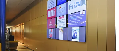 Symbole de l'entrée du Learning center d'Assas et reflet de l'image de l'université, les murs d'écrans Portalis sont à votre disposition pour diffuser vos réalisations