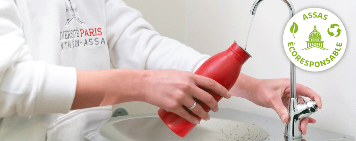À l'université, on compte en moyenne 11 000 litres de déchets par jour. Afin de limiter cette pollution et dans le but de favoriser une approche écoresponsable, l'université met à disposition de la communauté universitaire des fontaines à eau dans le hall du centre Assas. Les étudiants pourront se désaltérer grâce à quatre fontaines : deux d'entre elles sont placées à côté du bar à salades (le Bodin), les deux autres près des escaliers menant à la mezzanine et à la bibliothèque.