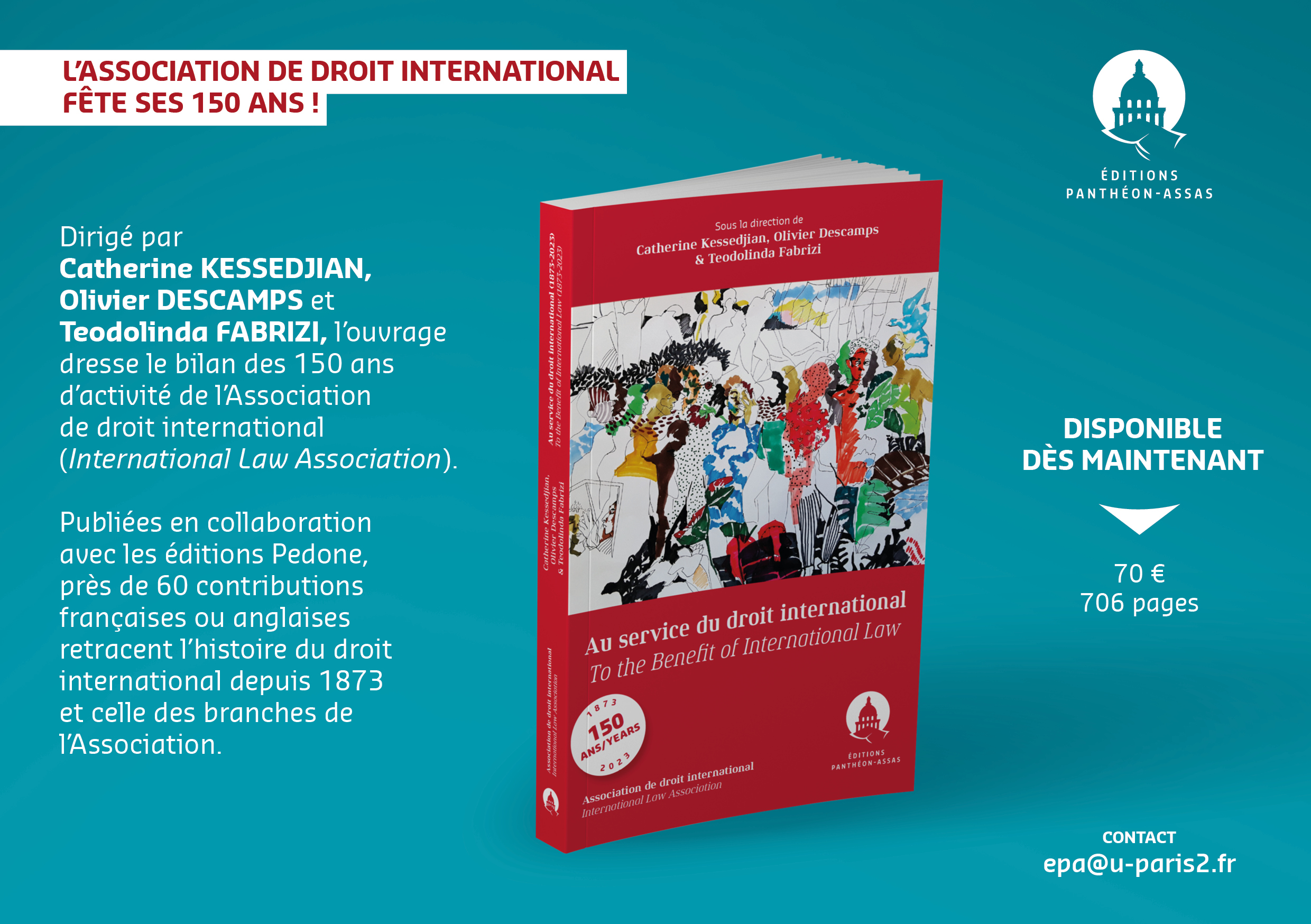 À l’occasion des 150 ans de la fondation de l’Association de droit international (International Law Association), les Éditions Panthéon-Assas et les éditions Pedone se sont associées pour publier Au service du droit international, dirigé par les professeurs Catherine KESSEDJIAN, Olivier DESCAMPS et la doctorante Teodolinda FABRIZI. L’ouvrage revient sur le contexte dans lequel l’association a été créée en 1873, résume ensuite l’implication des branches qui la composent et observe enfin son influence dans le développement de divers secteurs du droit international après 150 ans d’activité.