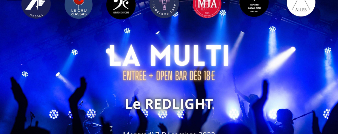 3eme édition de La Multi : une soirée open bar dans une boîte de nuit organisée par 7 associations (Al-liés ; Hip Hop Assas ; MJA ; Baby Assas ; Le Cru ; Assas de Concert ; Les Ailes)