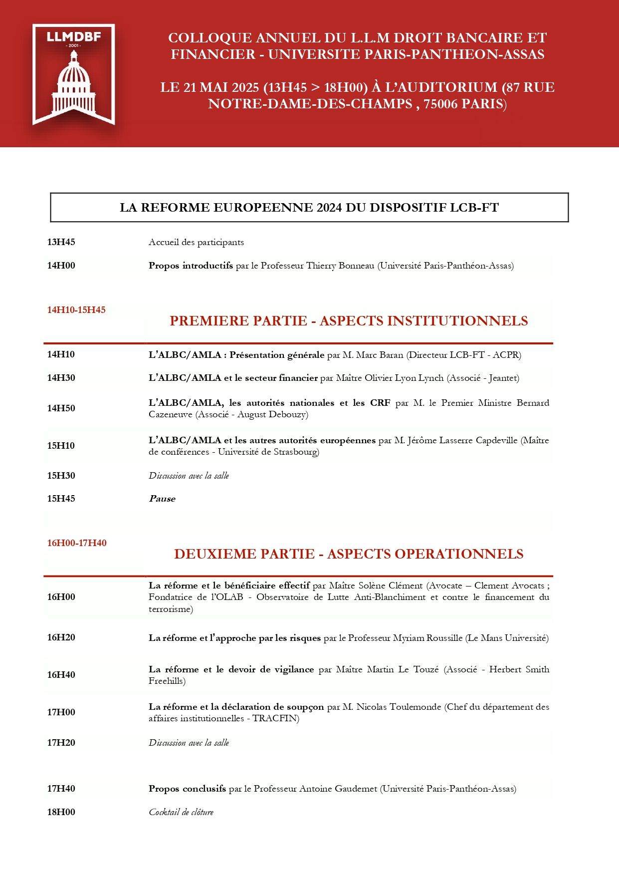 Afin de prendre la pleine mesure de la réforme européenne 2024 du dispositif LCB-FT, l’association étudiante du L.L.M Droit Bancaire et Financier de l’Université Paris-Panthéon-Assas y consacre son colloque annuel qui aura lieu le 21 mai 2025 de 13h30 à 18h au sein de l’Auditorium (Centre 87 NDC ; 87, rue Notre-Dame-des-Champs, 75006 Paris). Une captation vidéo du Colloque est également prévue.
