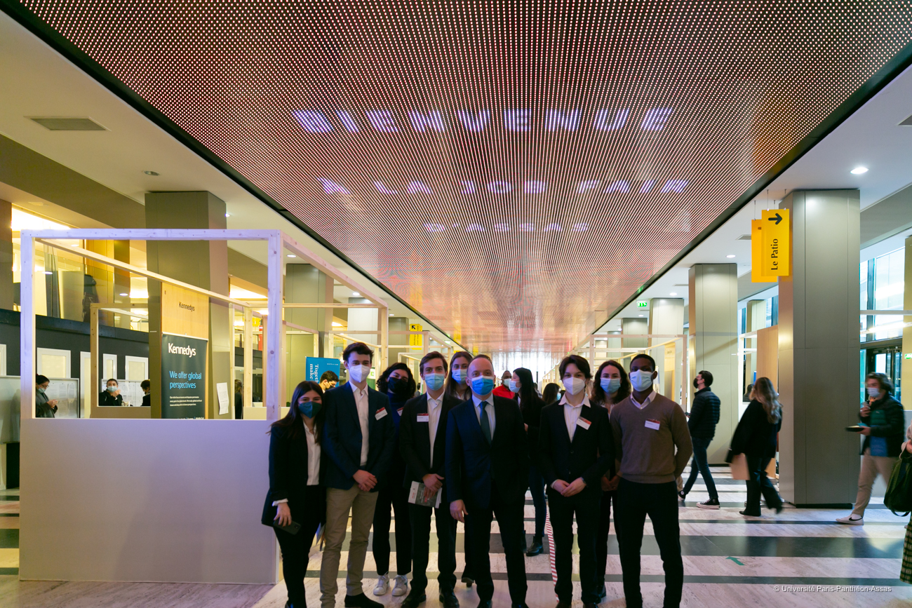 Le président de l'Université Panthéon-Assas et les ambassadeurs de la Job Fair 2022 (Rita ZEIDI, Alban BOUCHE, Sarah BELMEKKI, Lucas TRIFFAULT, Iris DE LAPORTE, Souhail BOUMAHDI, Maëlle ROSSI, Franck ADOPO).