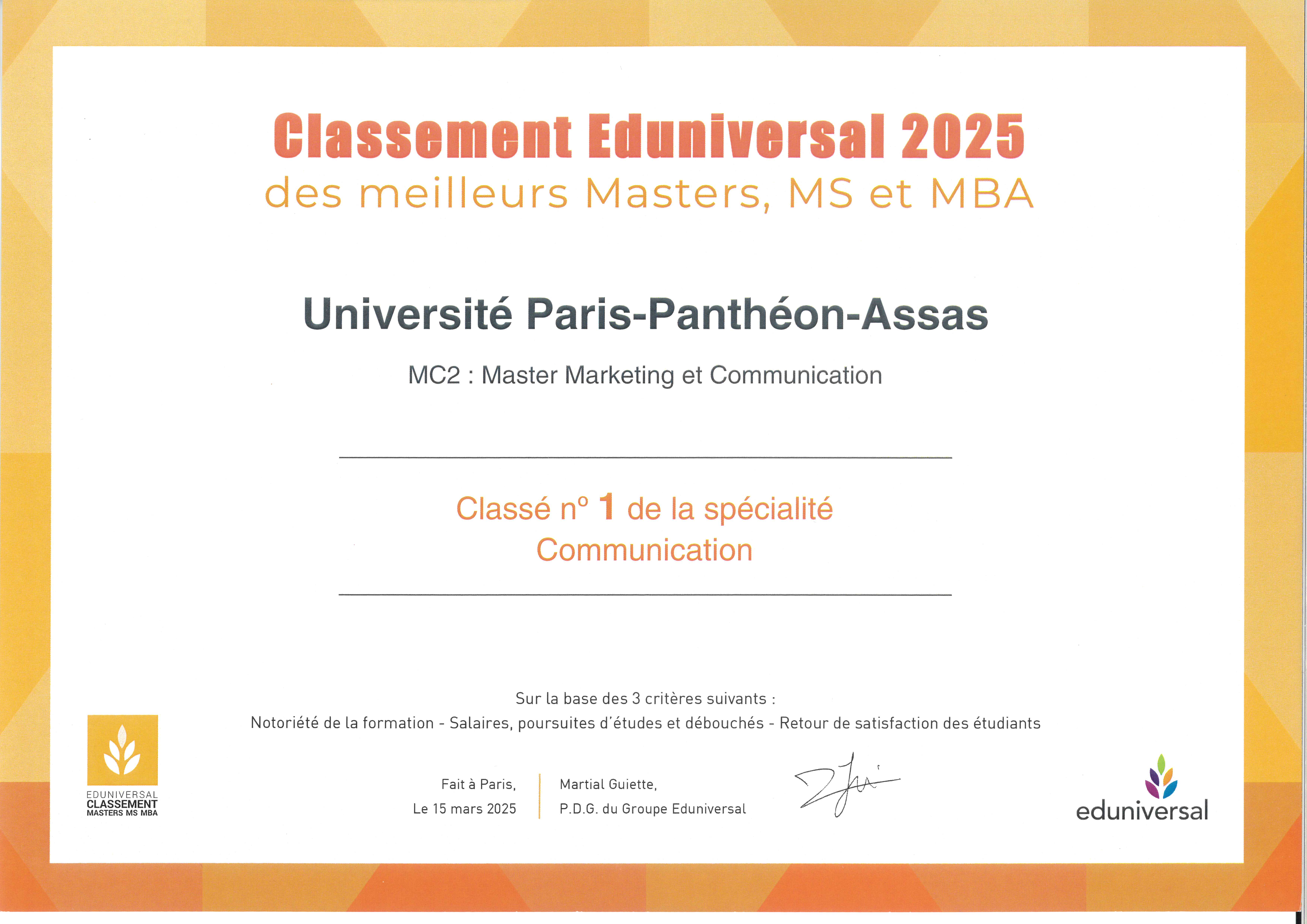 Cette année, le Master MC2 Marketing et Communication de l'Université Paris-Panthéon-Assas, dirigé par la Professeure Virginie Pez, arrive de nouveau en tête du classement des meilleurs masters en Communication par EDUNIVERSAL !
