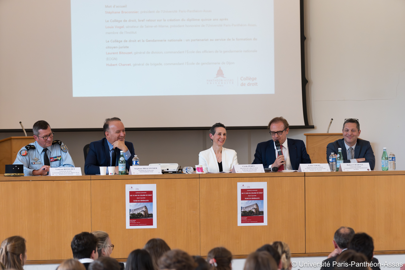 Les généraux Laurent BITOUZET et Hubert CHARVET, respectivement commandants de l’École de la gendarmerie nationale (EOGN) et de l’École de gendarmerie de Dijon, ont insisté sur la nécessité de créer des consciences citoyennes tant chez le gendarme que chez le juriste. Cette proximité entre ces deux vocations différentes justifie l’existence de partenariats avec le Collège de droit, notamment lors de séminaires d’intégration.